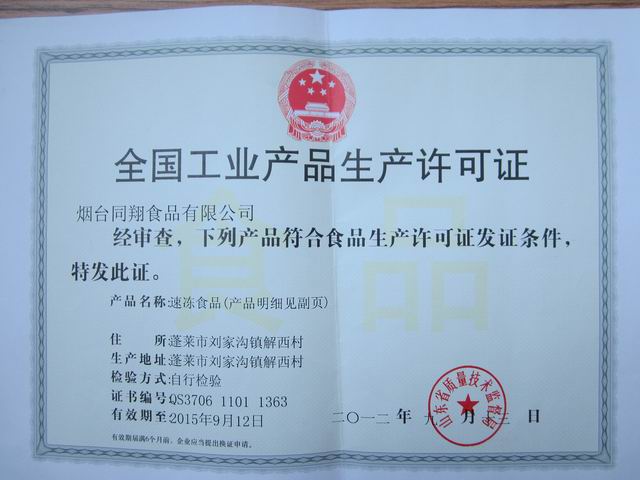 2012年9月  當社は順調にQS審査を通過した、食品生産許可証を受けた、會社の製品を販売できることになります、範囲は全國の各地域及びインターネットで。